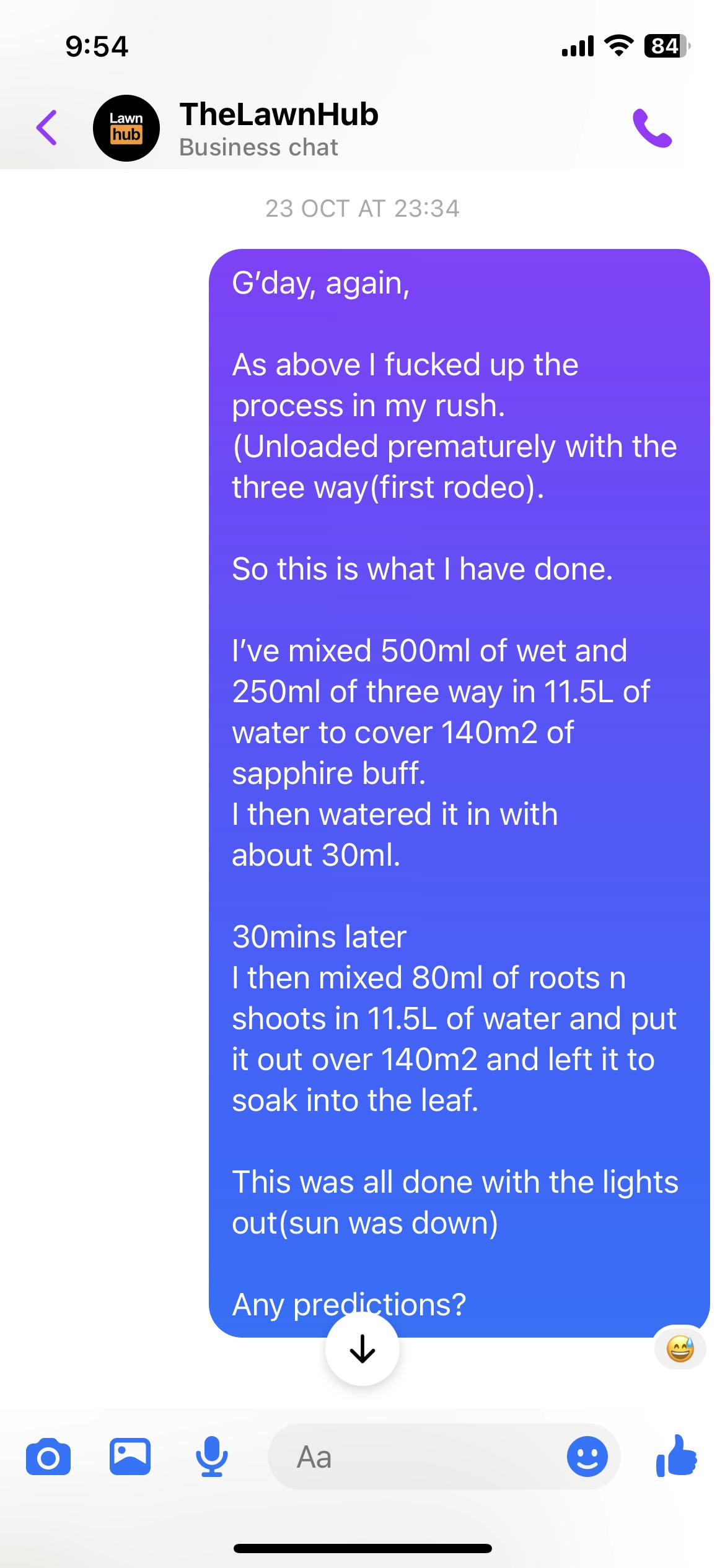 If you are using this product as a foliar fertiliser, ensure sufficient soil moisture levels and simply mix 200ml with 10L of water and spray on the leaf of the grass. This mix will cover 100m2. If applying as a foliar fertiliser, make sure you delay mowing for at least 24 hours post application.